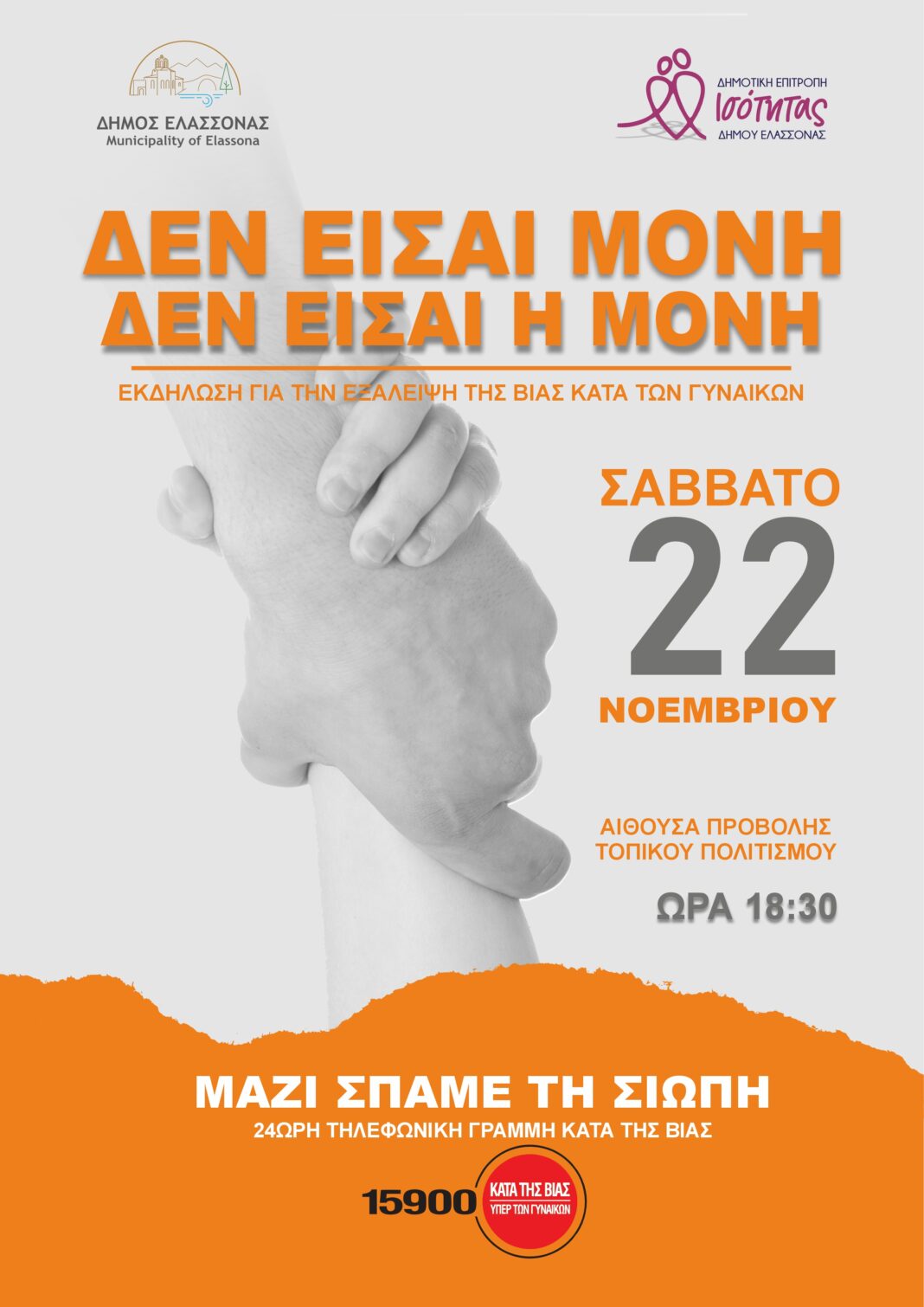 Ηχηρό μήνυμα απέναντι σε κάθε μορφή βίας που υφίστανται οι γυναίκες, συνιστά η εκδήλωση της Δημοτικής Επιτροπής Ισότητας του Δήμου Ελασσόνας, με αφορμή την 25η Νοεμβρίου – Διεθνή Ημέρα για την Εξάλειψη της Βίας κατά των Γυναικών.