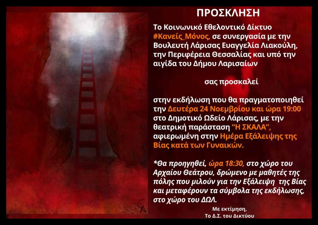 Συγκεκριμένα, το Κοινωνικό Εθελοντικό Δίκτυο  #Κανείς_Μόνος, σε συνεργασία με την Βουλευτή Λάρισας Ευαγγελία Λιακούλη – ιδρύτρια του Δικτύου, την Περιφέρεια Θεσσαλίας και υπό την αιγίδα του Δήμου Λαρισαίων, καλεί όλους τους συμπολίτες στην ανοιχτή κοινωνική εκδήλωση που θα πραγματοποιηθεί με κύριο μέρος της μια θεατρική παράσταση , αφιερωμένη στην Ημέρα Εξάλειψης της Βίας κατά των Γυναικών, από το Θεατρικό Εργαστήρι του Δήμου Κιλελέρ.