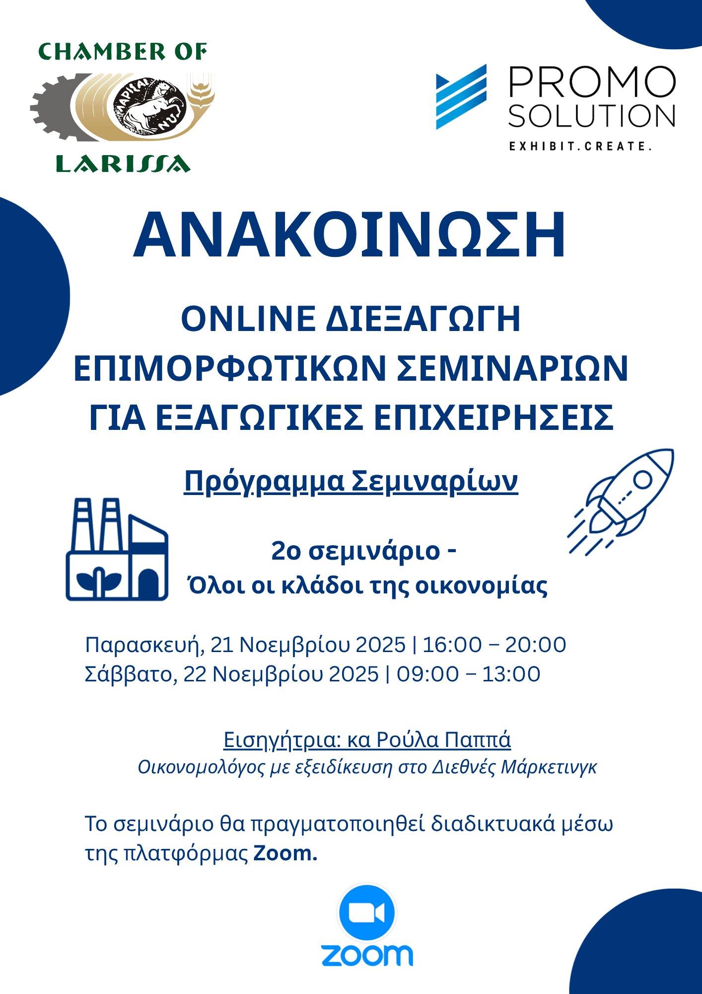 Από το Επιμελητήριο Λάρισας ανακοινώνεται ότι, λόγω κωλύματος της εισηγήτριας για τη δια ζώσης πραγματοποίηση του προγραμματισμένου στις 21 και 22 Νοεμβρίου 2025 σεμιναρίου των εξαγωγών, σας ενημερώνουμε ότι το σεμινάριο θα πραγματοποιηθεί διαδικτυακά και το Zoom link μέσω του οποίου μπορούν να το παρακολουθήσουν όλοι οι συμμετέχοντες και τις 2 ημέρες είναι το κάτωθι: