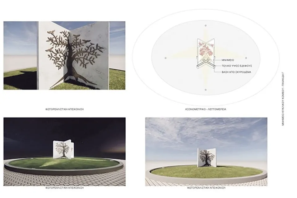 Αν και ο κόμβος είχε δοθει στη κυκλοφορία εδώ και αρκετό καιρό, στον ενδιάμεσο χώρο φαινόταν κάτι να λείπει. Το μνημείο που ξεκίνησε να τοποθετείται τις τελευταίες μέρες στο σημείο είναι δημιουργία του Λαρισαίου εικαστικού και αρχιτέκτονα Αλέξανδρου Ιακωβάκη και είναι αφιερωμένο στις έννοιες της ρίζας, της πατρίδας και της μνήμης.
