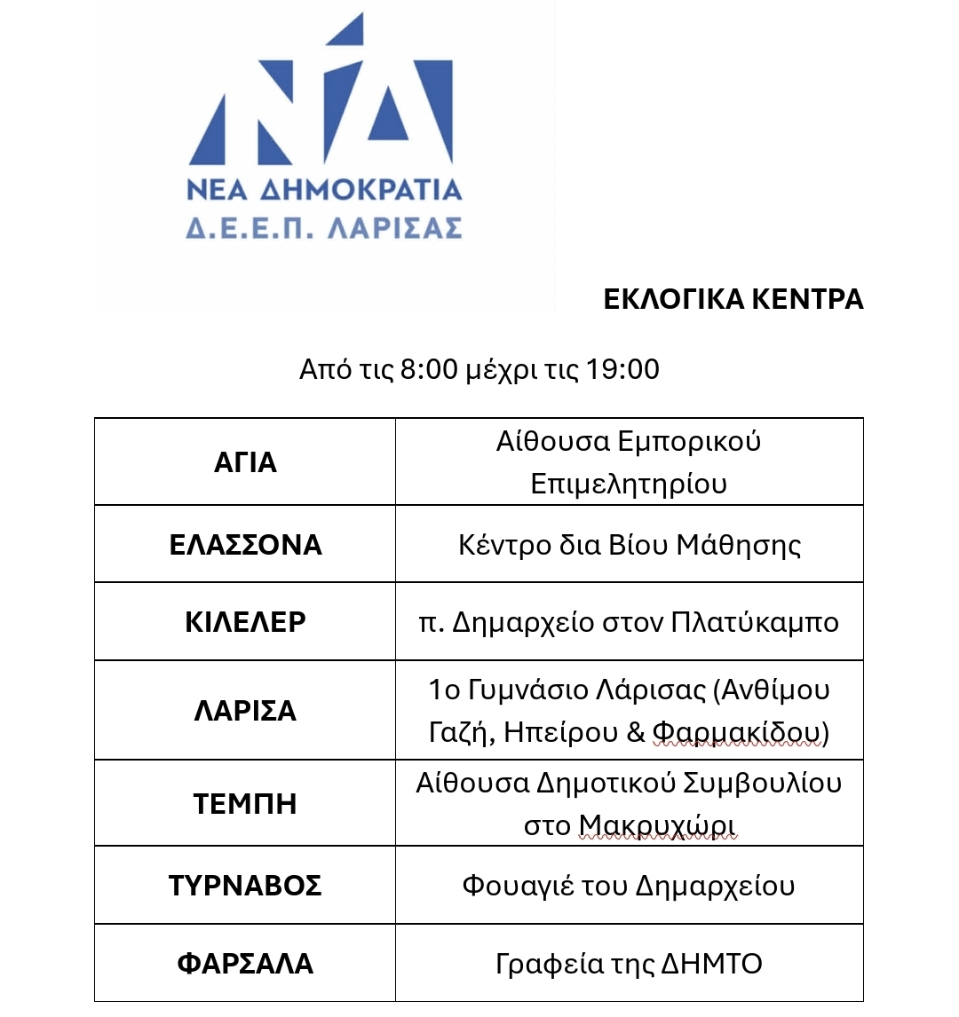Σήμερα Κυριακή 23 Νοεμβρίου 2025 και από 08:00 π.μ. έως 7:00 μ.μ. θα διεξαχθούν οι εσωκομματικές εκλογές της Νέας Δημοκρατίας στο Νομό Λάρισας.