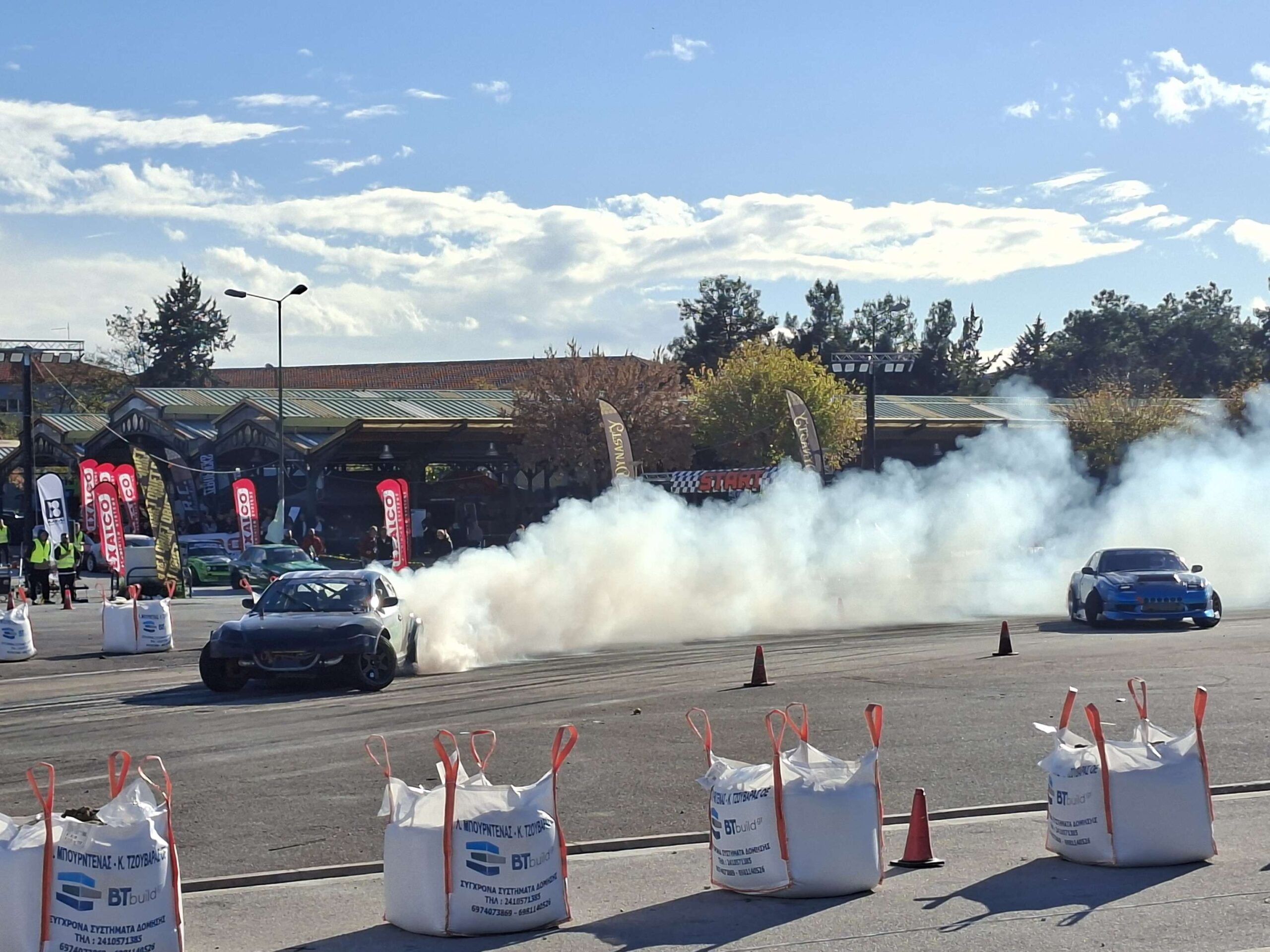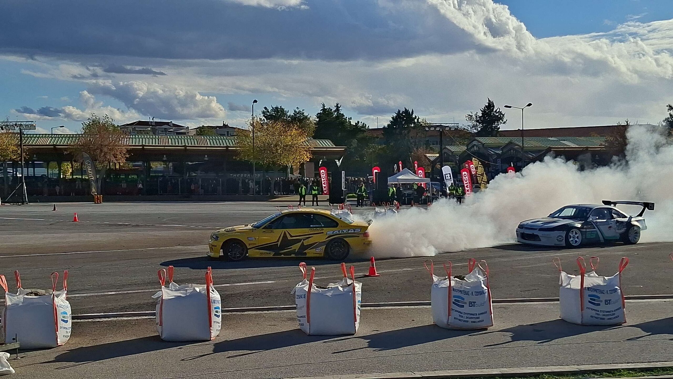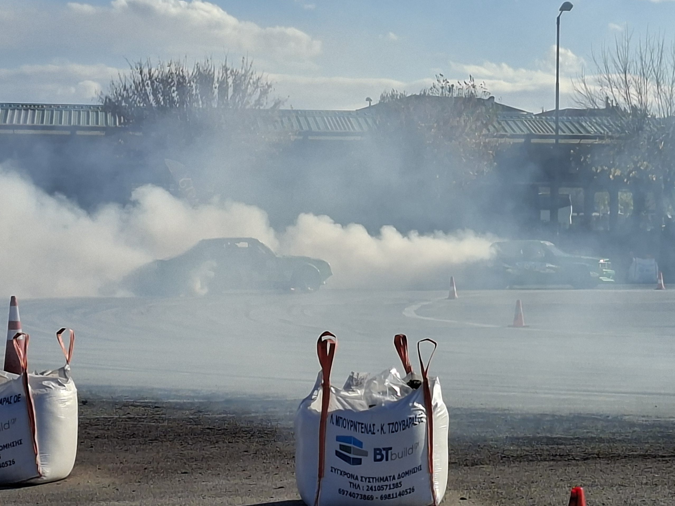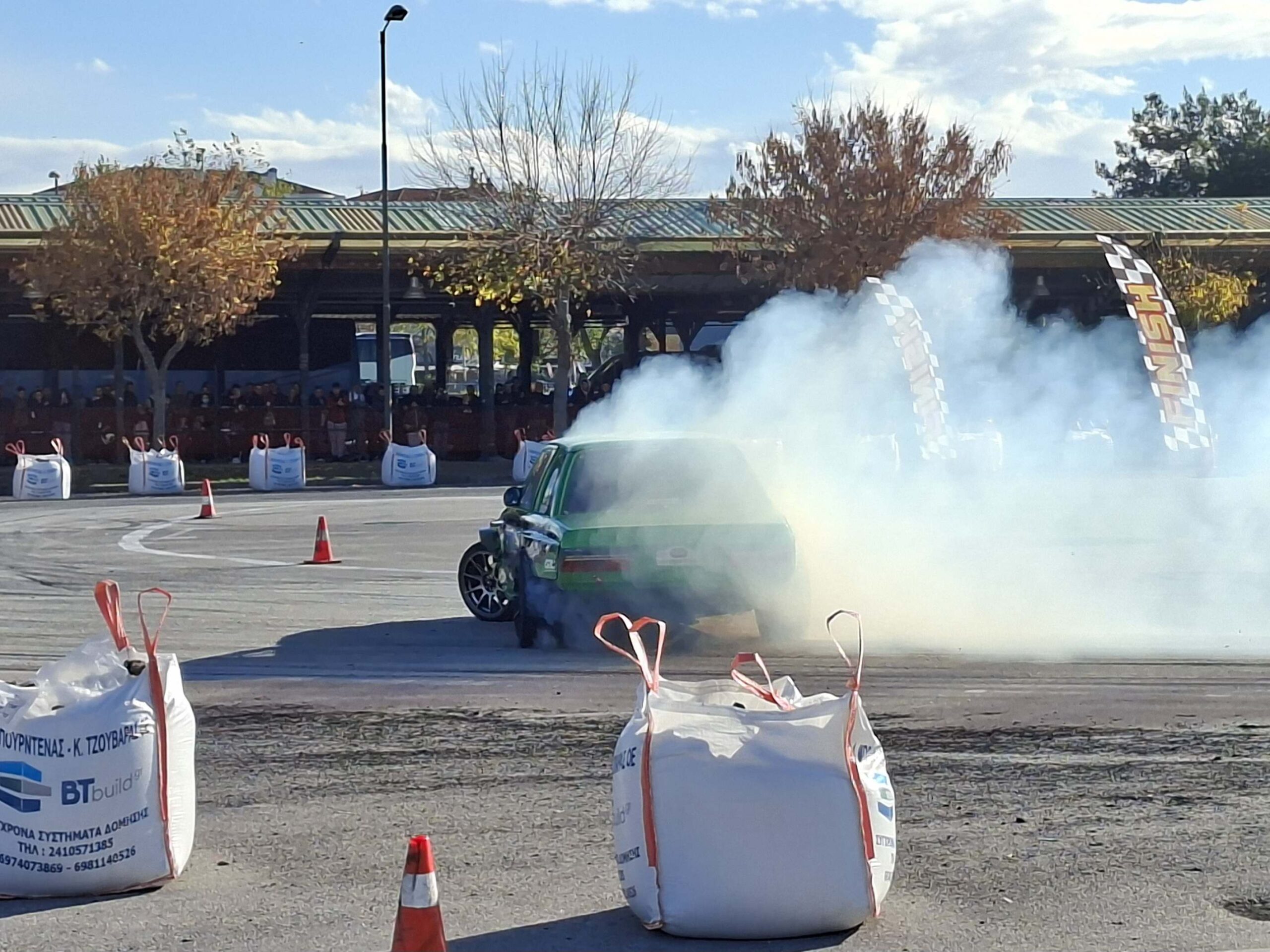 Με την έντονη μυρωδιά του καμένου ελαστικού συνεχίστηκε για την δεύτερη και τελευταία μέρα το Super Drift Λάρισας στην Σκεπαστή αγορά της Νεάπολης.