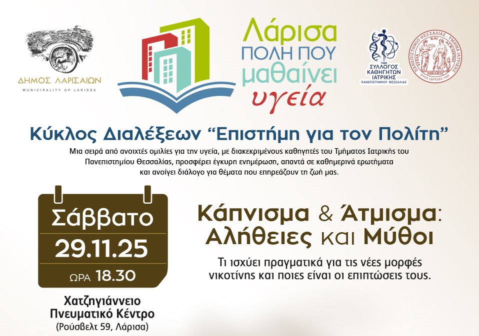 Δήμος Λαρισαίων: 5η Διάλεξη Υγείας – «Κάπνισμα & Άτμισμα: Αλήθειες και Μύθοι» – Το Σάββατο στο Χατζηγιάννειο Πνευματικό Κέντρο