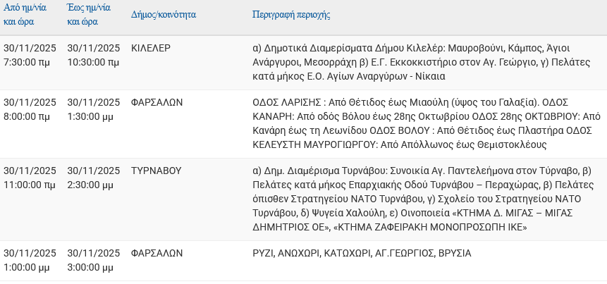 Σε προγραμματισμένες διακοπές ρεύματος προχωρά ο ΔΕΔΔΗΕ Α.Ε., σήμερα Κυριακή 30 Νοεμβρίου, σε περιοχές του νομού Λάρισας και του Δήμου Κιλελέρ για να εκτελεσθούν απαραίτητες τεχνικές εργασίες στο δίκτυο.