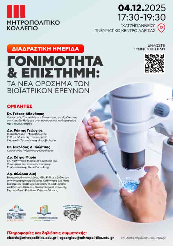 Το Πανεπιστήμιο των Πολιτών του Δήμου Λαρισαίων, στο πλαίσιο της «Λάρισα – Πόλη που Μαθαίνει», σε συνεργασία με τη Σχολή των Βιοϊατρικών Επιστημών (BSc, Hons, University of East London) του Μητροπολιτικού Κολλεγίου, διοργανώνουν την ημερίδα «Γονιμότητα & Επιστήμη: Τα Νέα Ορόσημα των Βιοϊατρικών Ερευνών», η οποία θα πραγματοποιηθεί την Πέμπτη 4 Δεκεμβρίου 2025, ώρα 17:30-19:30, στο Χατζηγιάννειο Πνευματικό Κέντρο.