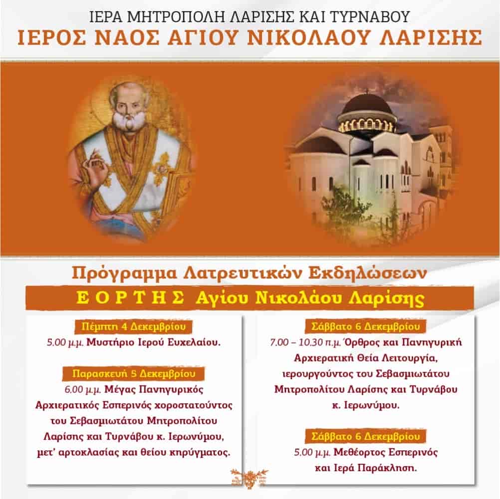 Στις 6 Δεκεμβρίου, εορτή του εν Αγίοις Πατρός ημών Νικολάου του θαυματουργού και μυροβλήτου, πανηγυρίζει ο φερώνυμος Ιερός Ναός του Αγίου Νικολάου Λαρίσης. Το πρόγραμμα εορτασμού του Ιερού Ναού έχει ως εξής: