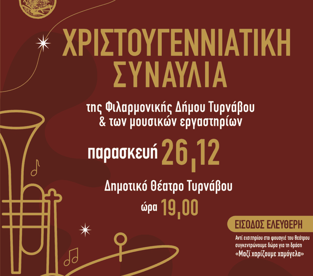 Χριστουγεννιάτικη συναυλία της Φιλαρμονικής Δήμου Τυρνάβου θα πραγματοποιηθεί την Παρασκευή 26 Δεκεμβρίου 2025 στις 7:00μμ στο Δημοτικό Θέατρο Τυρνάβου.