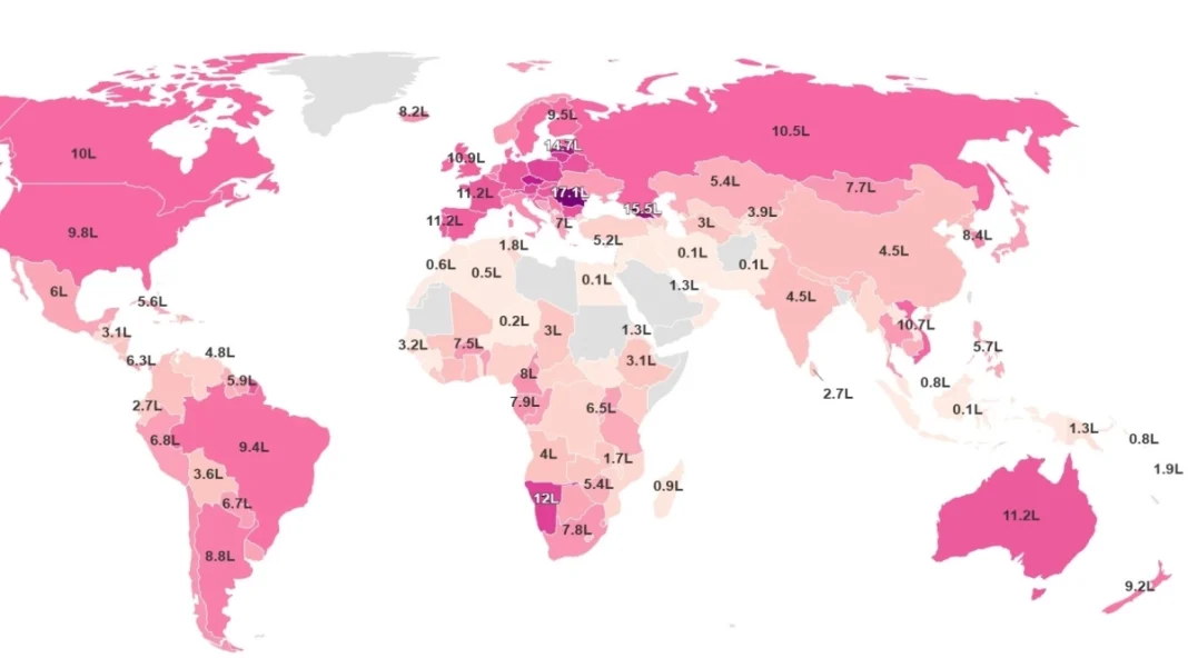 Στην άλλη πλευρά του Ατλαντικού, οι Ηνωμένες Πολιτείες και ο Καναδάς βρίσκονται χαμηλότερα από τις ευρωπαϊκές κορυφές, με κατανάλωση γύρω στα 10 λίτρα ανά άτομο. Πρόκειται για επίπεδα σημαντικά, αλλά όχι ακραία σε σύγκριση με την ευρωπαϊκή πραγματικότητα.