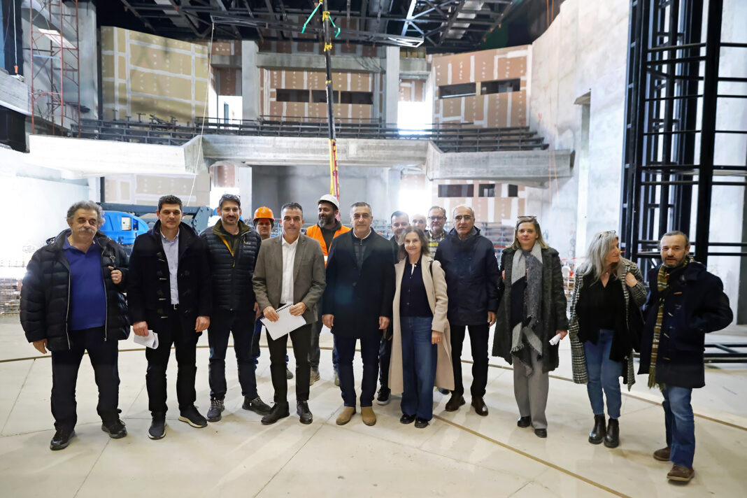 Κατά την ξενάγηση που πραγματοποίησε η επιβλέπουσα μηχανικός του Δήμου κα Σοφία Ρωμανάσου, οι κ.κ. Κουρέτας, Μαμάκος ενημερώθηκαν ότι αυτή τη στιγμή πραγματοποιούνται εργασίες στην αίθουσα των θεατών, που είναι πολύ κομβικές για το κτίριο, καθώς μετά την ολοκλήρωσή τους θα επιτραπεί να προχωρήσουνε τα συνεργία στις λοιπές εργασίες. Οι τρέχουσες ηλεκτρομηχανολογικές εργασίες αφορούν στο θόλο της αίθουσας των θεατών, ο οποίος θα καλυφθεί με ξύλινη επένδυση με την αποπεράτωσή τους. Το επόμενο στάδιο των εργασιών αφορά στην τοποθέτηση του δαπέδου της αίθουσας των θεατών και των καθισμάτων, καθώς και του δαπέδου της σκηνής. Η κα Ρωμανάσου διευκρίνισε ότι έχουν από πέρυσι ολοκληρωθεί οι εργασίες που αφορούσαν στο αναβατόριο της σκηνής, τον μηχανισμό του περιστρεφόμενου τμήματος αυτής, οι οποίοι έχουν ελεγχθεί ως προς τη λειτουργία τους και πιστοποιηθεί. Μετά την ολοκλήρωση των ξύλινων επενδύσεων στην αίθουσα των θεατών και στη σκηνή, θα ακολουθήσουν εργασίες τελικών επενδύσεων στα δύο φουαγιέ, καθώς και λοιπές μικροεργασίες τελικού σταδίου.