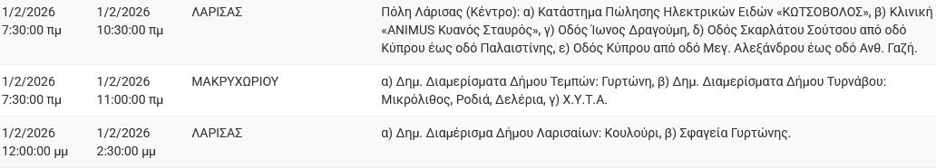 Σε προγραμματισμένες διακοπές ρεύματος προχωρά ο ΔΕΔΔΗΕ Α.Ε., σήμερα Κυριακή 1 Φεβρουαρίου, σε περιοχές του νομού Λάρισας για να εκτελεσθούν απαραίτητες τεχνικές εργασίες στο δίκτυο.