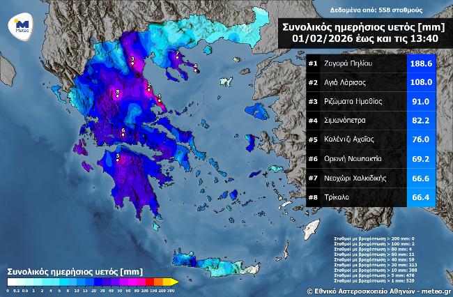 Μεγάλα ύψη βροχής καταγράφηκαν έως το μεσημέρι της Κυριακής 1 Φεβρουαρίου 2026. Σύμφωνα με το δίκτυο αυτόματων μετεωρολογικών σταθμών του meteo.gr / Εθνικού Αστεροσκοπείου Αθηνών, το μεγαλύτερο ύψος βροχής έως τις 13:40 καταγράφηκε στο Πήλιο και πιο συγκεκριμένα στη Ζαγορά Πηλίου (189 χιλιοστά). Στον χάρτη της σχετικής εικόνας παρουσιάζεται η κατανομή της βροχόπτωσης στη χώρα και οι 8 σταθμοί με τα μεγαλύτερα ύψη βροχής. Όπως προκύπτει από τις επιπλέον πληροφορίες που παρέχονται στην εικόνα, βροχή (περισσότερη του 1 χιλιοστού) καταγράφηκε στο μεγαλύτερο μέρος της χώρας και πιο συγκεκριμένα σε 529 από τους 558 ενεργούς σταθμούς.