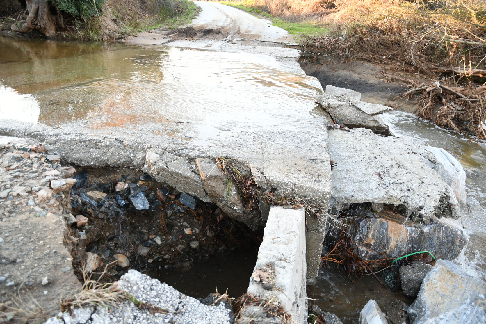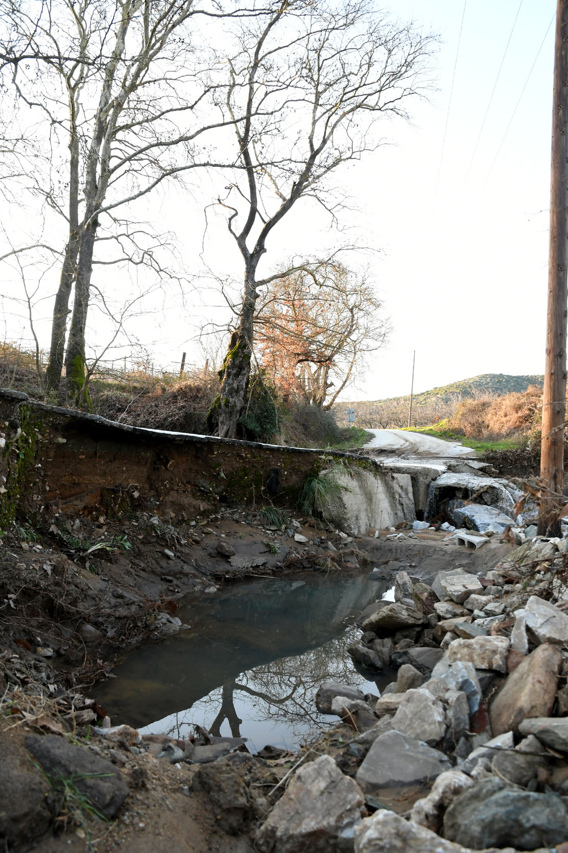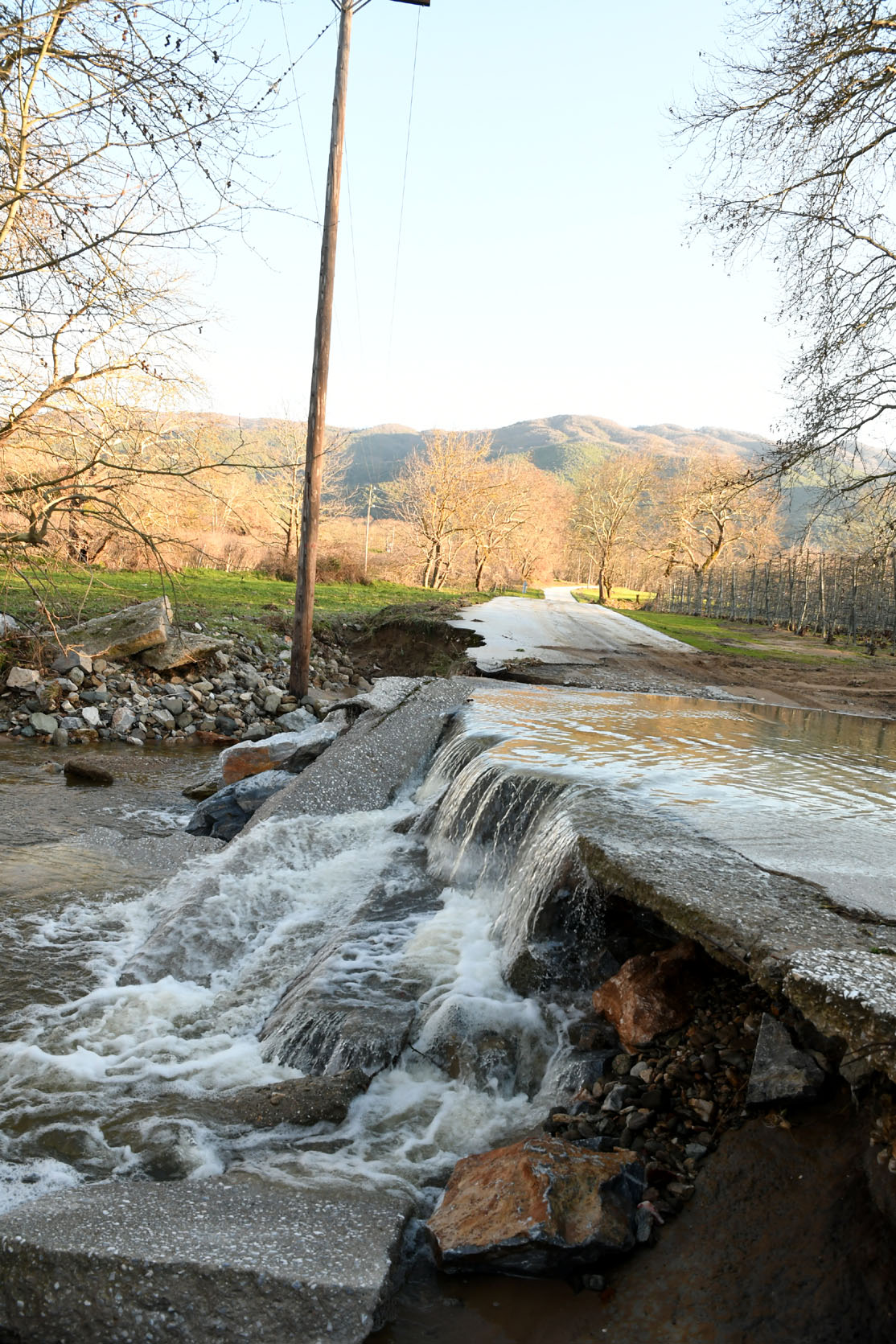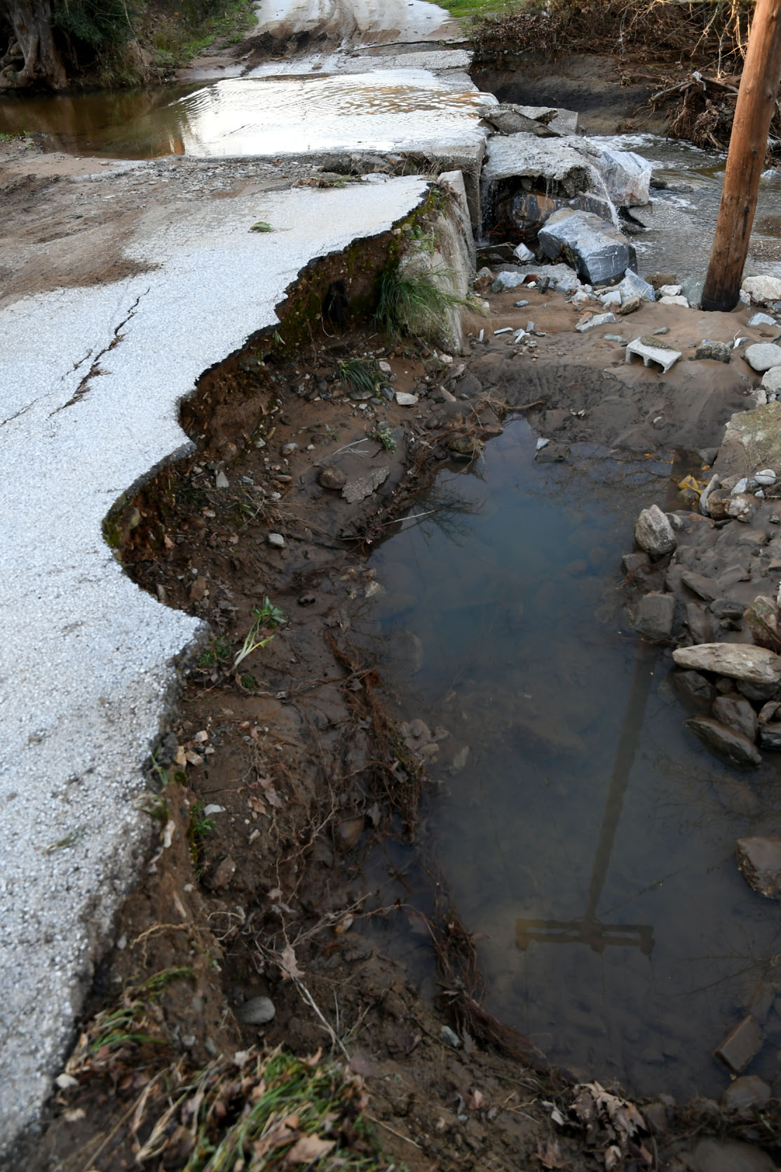 Φωτογραφίες από την περιοχή της Ποταμιάς (κομμένος στα δύο ο δρόμος Ποταμιά – Αετόλοφος, κατεστραμμένο το αγροτικό δίκτυο, βυθισμένες στη λάσπη οι καλλιέργειες):