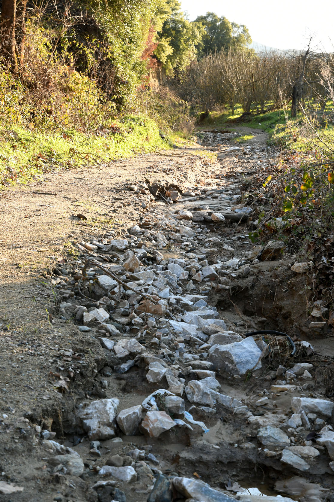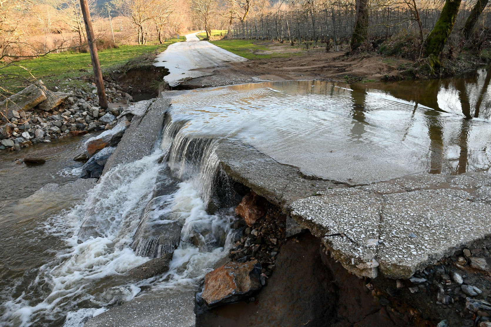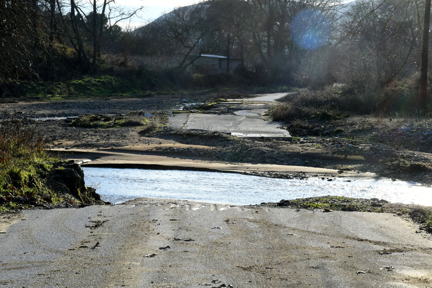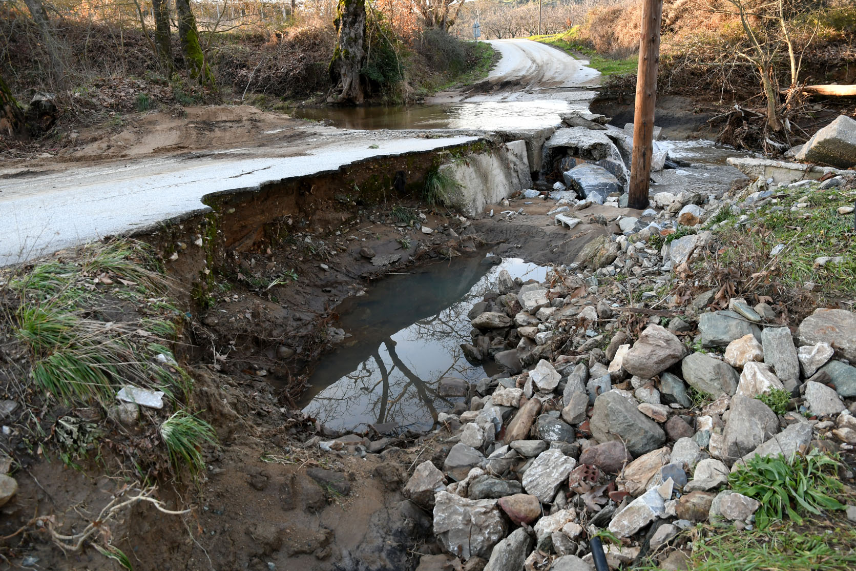 Φωτογραφίες από την περιοχή της Ποταμιάς (κομμένος στα δύο ο δρόμος Ποταμιά – Αετόλοφος, κατεστραμμένο το αγροτικό δίκτυο, βυθισμένες στη λάσπη οι καλλιέργειες):