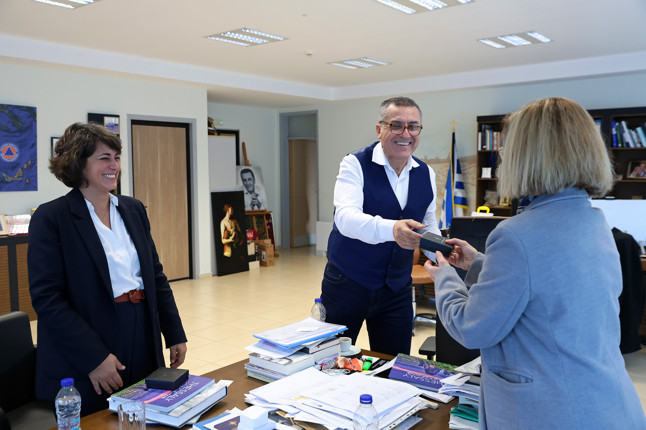 Η συνάντηση ολοκληρώθηκε με την προσφορά δώρων από τον κ. Κουρέτα στις κυρίες Μορφωτικές Ακολούθους της Γαλλικής Πρεσβείας, τα οποία περιλαμβάνανε τα λευκώματα «Η Θεσσαλία του Τάκη Τλούπα» και «Thessaly, a journey to myth and beauty» καθώς και μιας καρφίτσας σε σχήμα στάχυ που αποτελεί το σύμβολο της Θεσσαλίας.