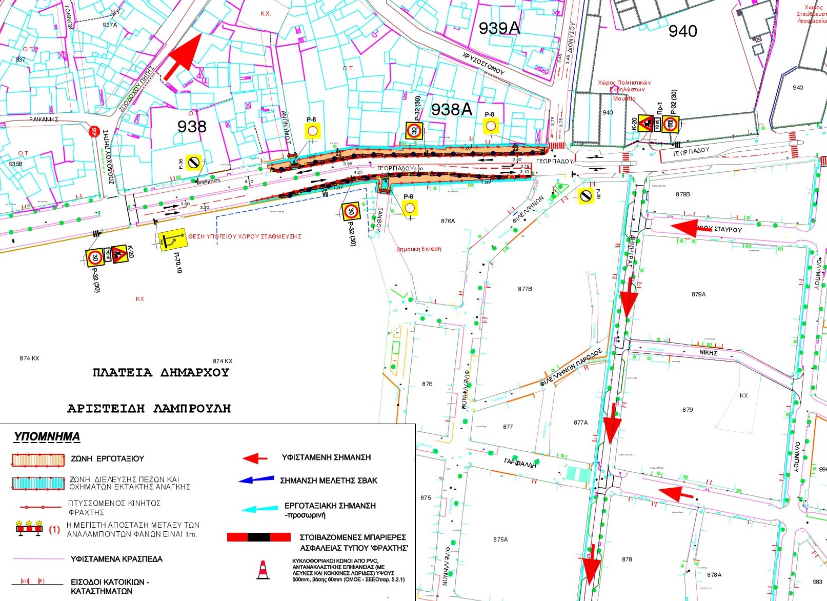 α) Γεωργιάδου (κατεύθυνση από την οδό Διονυσίου προς την ανώνυμη οδό [μεταξύ των ΟΤ 938 & 938 Α]) θα γίνεται σε μία λωρίδα κυκλοφορίας πλάτους 3,50 μ έως 3,55 μ (τοπική μείωση της λωρίδας κυκλοφορίας από 4,70μ), λόγω της στένωσης του οδοστρώματος στην δεξιά πλευρά της οδού, σύμφωνα με την κίνηση των οχημάτων από την οδό Διονύσου προς την ανώνυμη