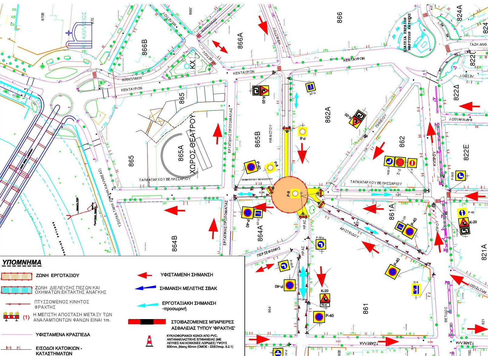 Κατά τη διάρκεια των παραπάνω εργασιών, η κυκλοφορία των οχημάτων θα διεξάγεται σύμφωνα με τις προβλεπόμενες πληροφοριακές και ρυθμιστικές πινακίδες που θα τοποθετηθούν από τον ανάδοχο του έργου.