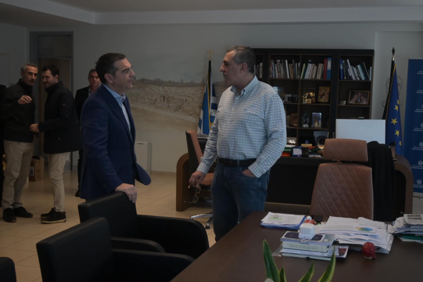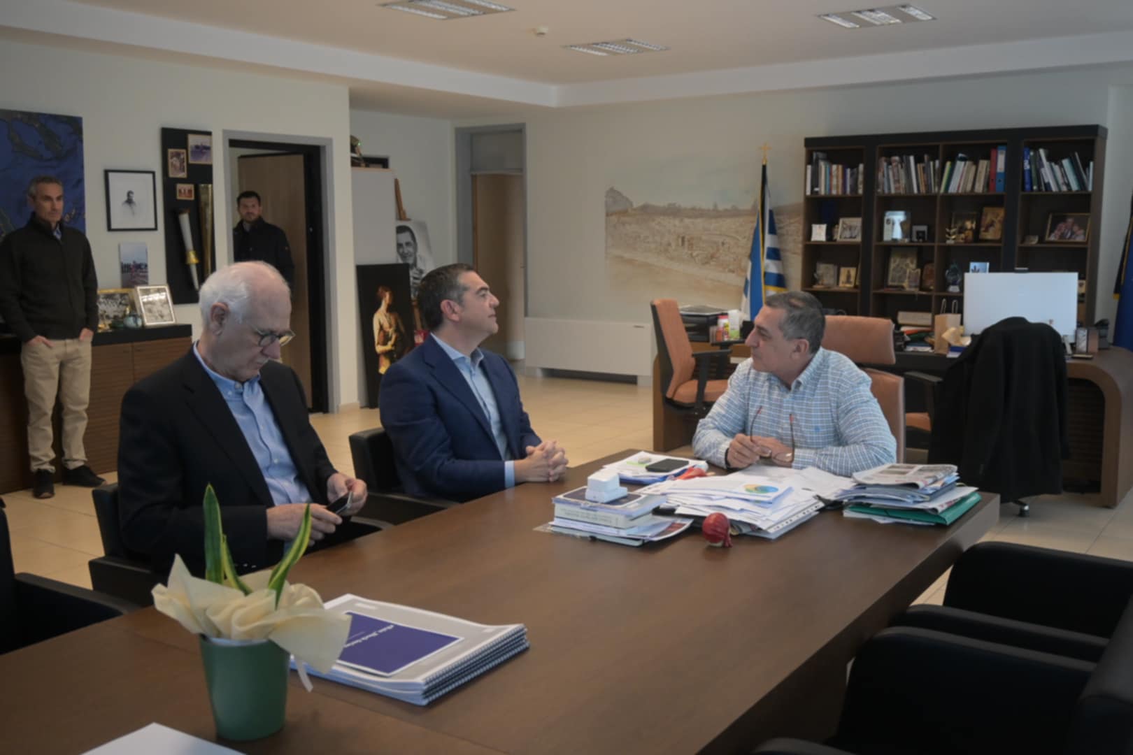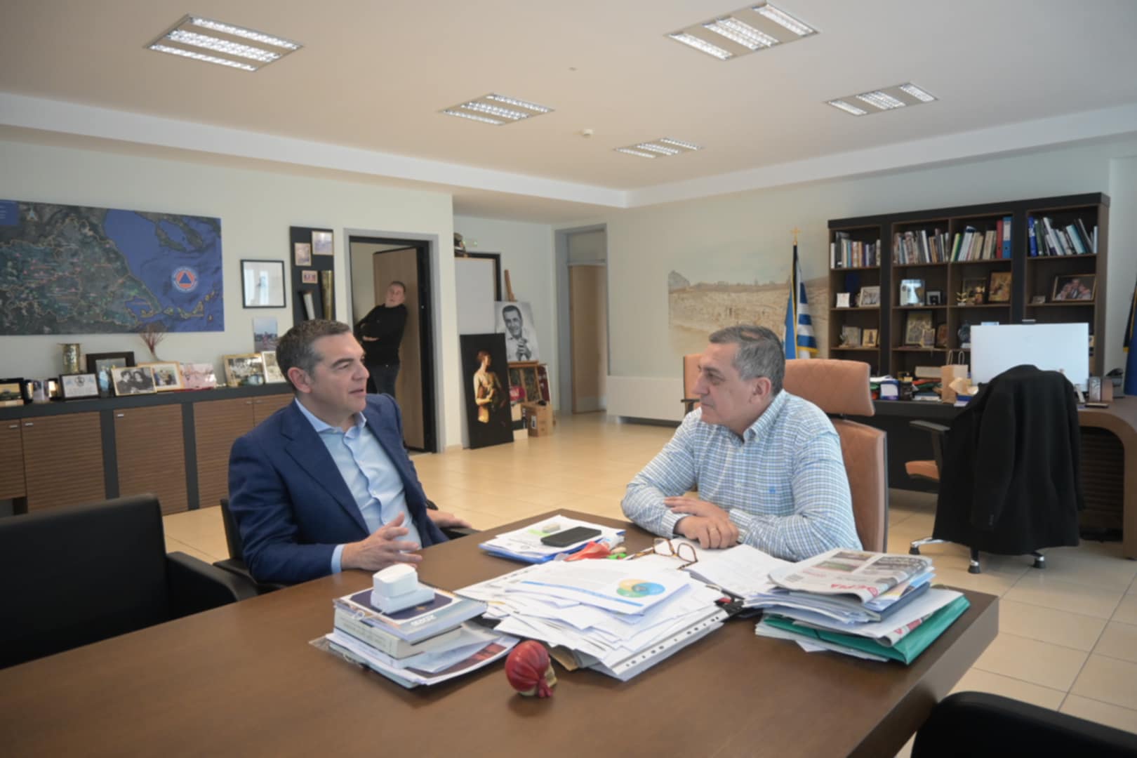 Έτσι, λοιπόν, το πρωί της Δευτέρας ο Αλέξης Τσίπρας συνοδευόμενος από τον πρώην δήμαρχο Λαρισαίων Απόστολο Καλογιάννη, βρέθηκε στην περιφέρεια αλλά και στο Κέντρο Πολιτικής Προστασίας και την Πυροσβεστική υπηρεσία που εδρεύουν εντός του κτιρίου της περιφέρειας.