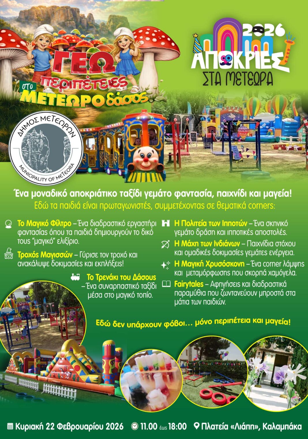 Ο Δήμος Μετεώρων προσκαλεί μικρούς και μεγάλους σε ένα μοναδικό αποκριάτικο ταξίδι γεμάτο φαντασία, παιχνίδι και μαγεία! Την Κυριακή 22 Φεβρουαρίου 2026, από τις 11:00 έως τις 18:00, η Πλατεία «Λιάπη» στην Καλαμπάκα μεταμορφώνεται σε ένα παραμυθένιο ΜΕΤΕΩΡΟδάσος, όπου τα παιδιά γίνονται πρωταγωνιστές σε έναν κόσμο γεμάτο χρώματα, γέλια και αξέχαστες εμπειρίες.