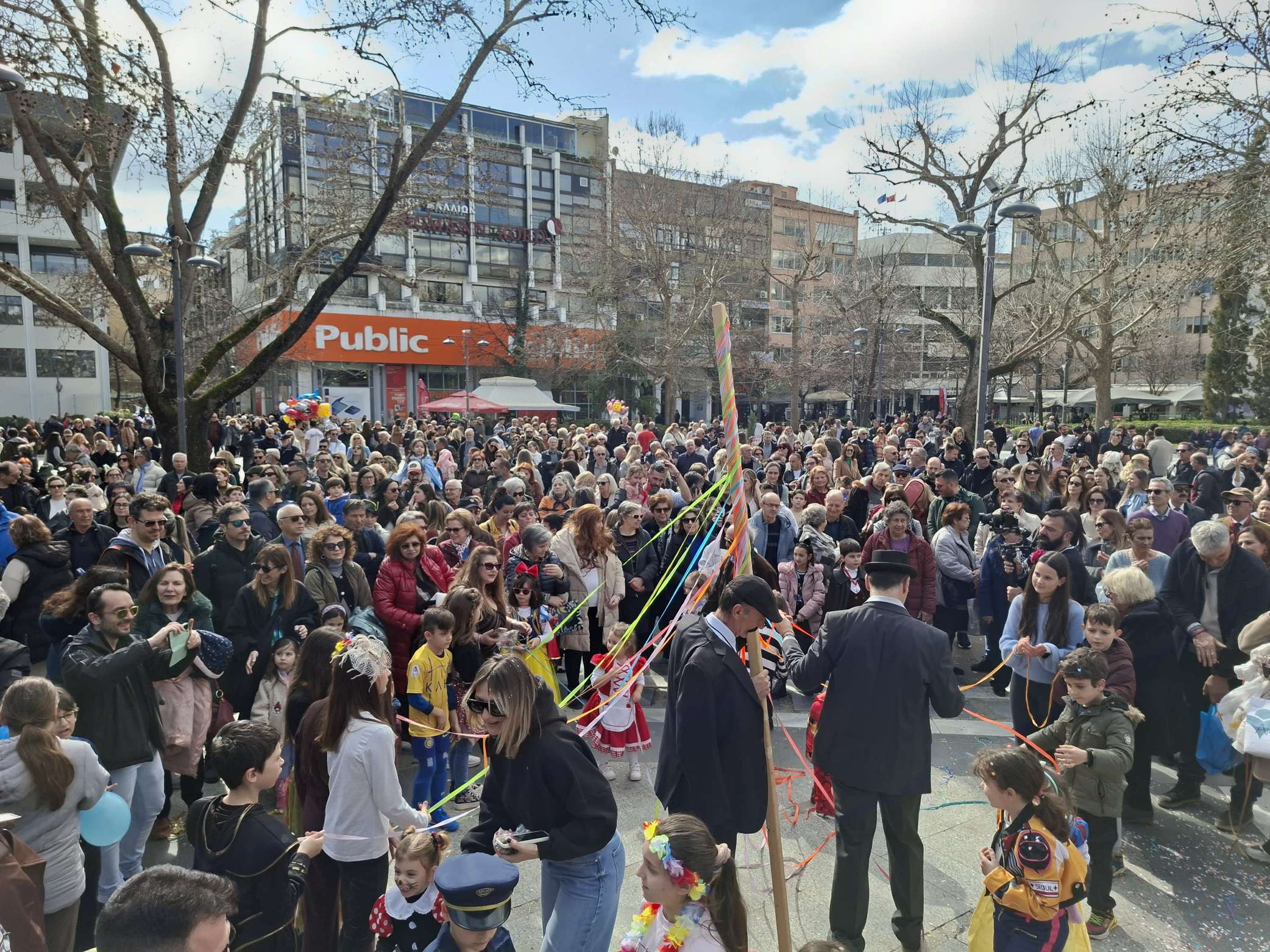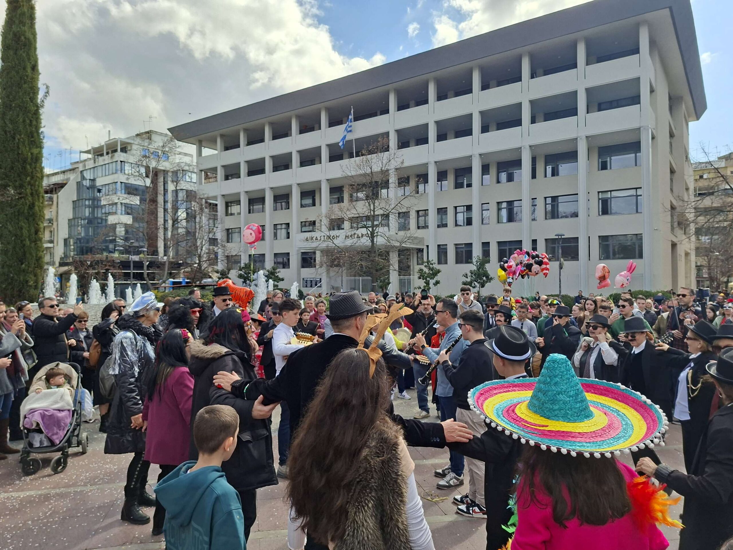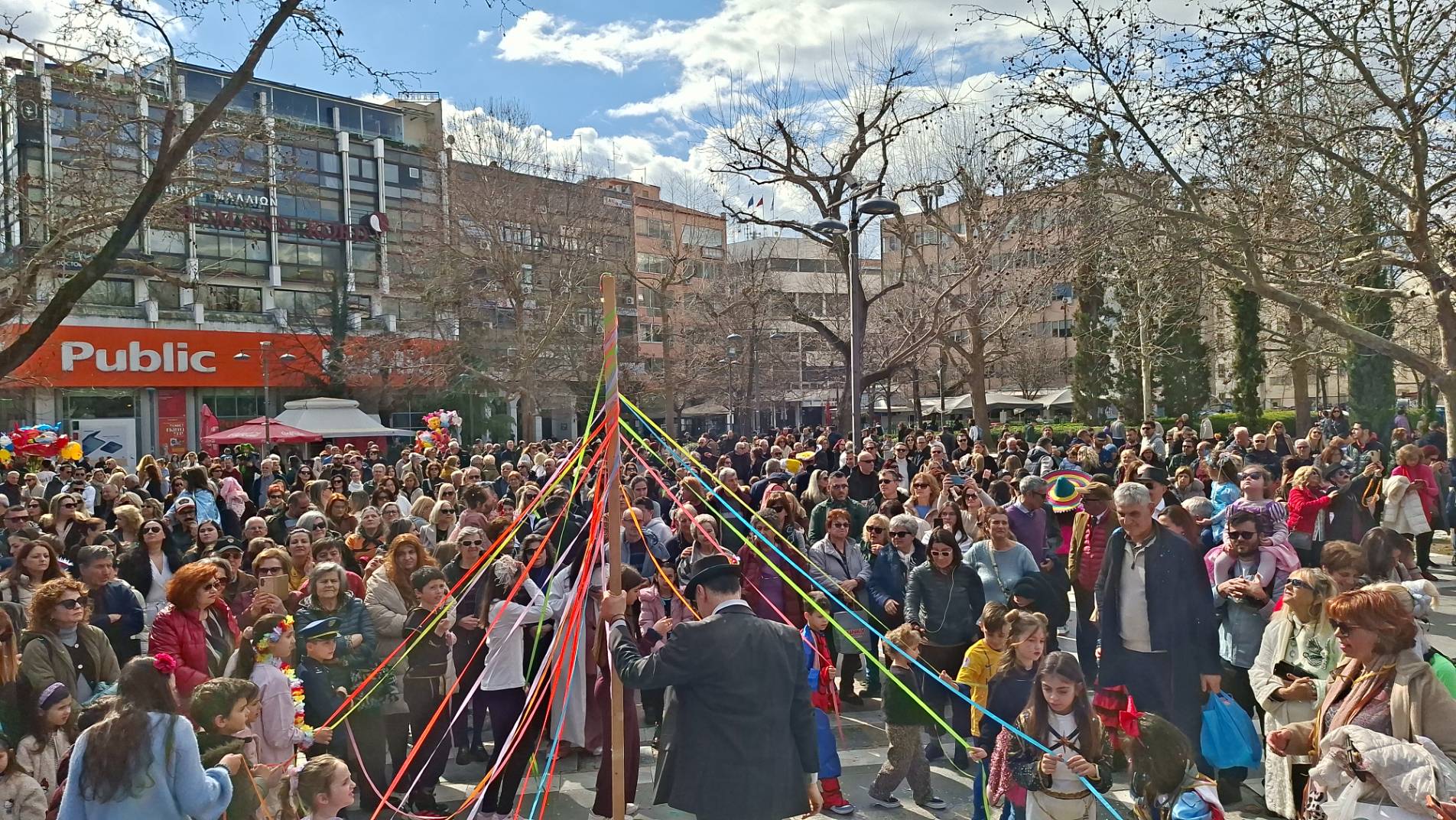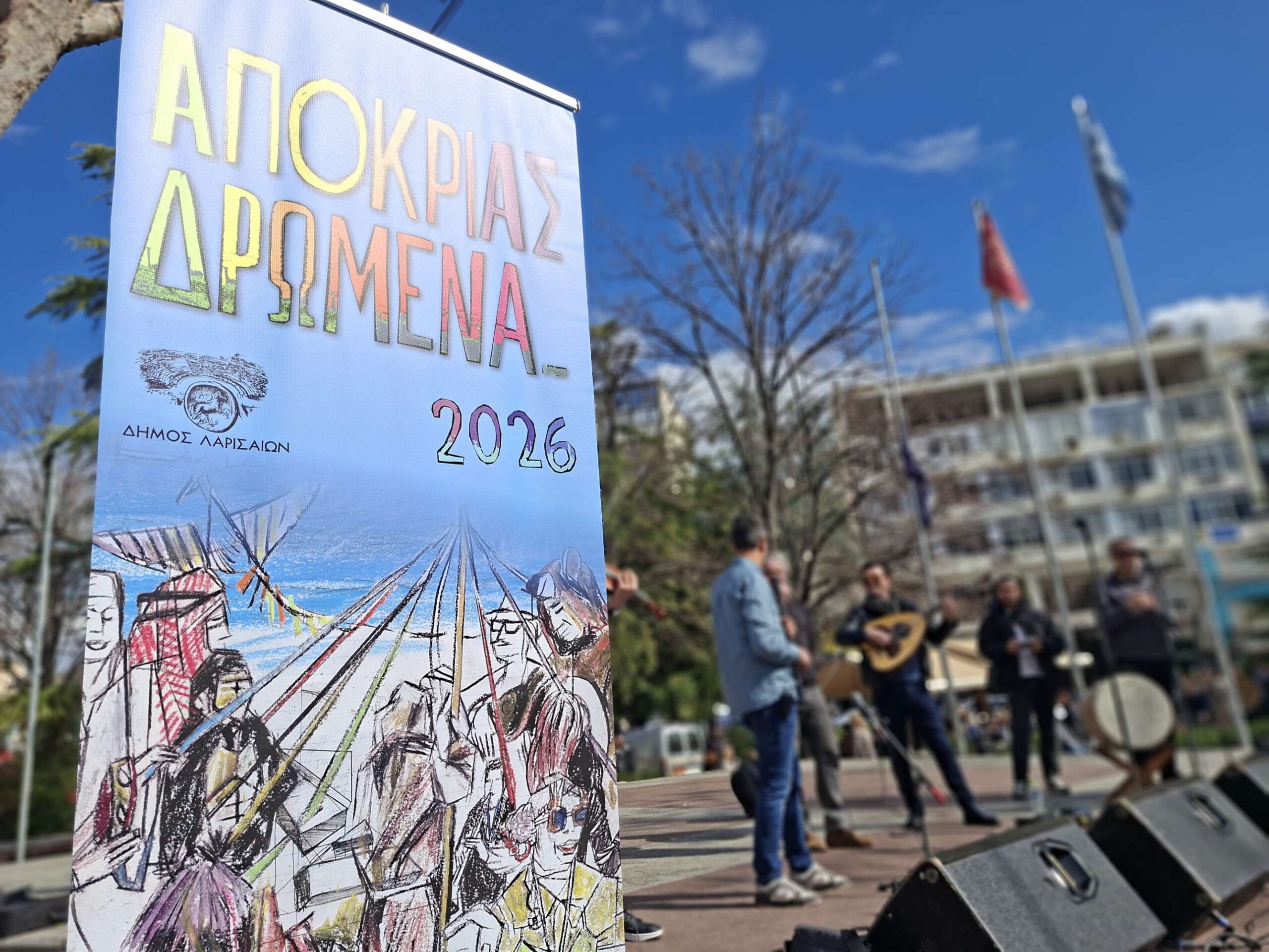 Στην κεντρική πλατεία στήθηκε ένα δεύτερο γλέντι με γαιτανάκι και παραδοσιακή μουσική, δίνοντας την ευκαιρία σε πολλούς Λαρισαίους να το ρίξουν έξω. Όπως χαρακτηριστικά δήλωσε ο Δήμαρχος Λαρισαίων Θανάσης Μαμάκος, “Αφήνουμε πίσω τις σκοτούρες της καθημερινότητας και γιορτάζουμε την ημέρα της Αποκριάς “.
