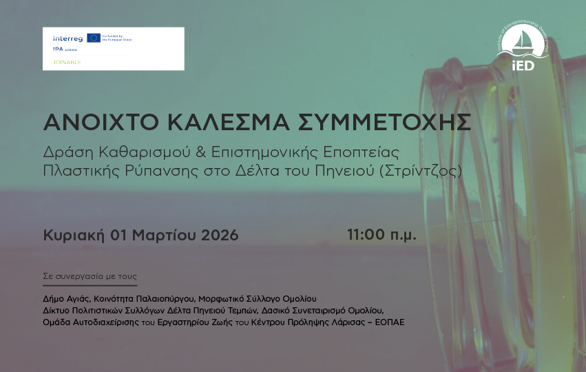 απευθύνει ανοιχτό κάλεσμα σε φορείς, συλλόγους, εθελοντές και ενεργούς πολίτες για να συμμετέχουν σε δράση καθαρισμού και επιστημονικής εποπτείας πλαστικής ρύπανσης που θα γίνει στην παραλία Στρίντζος στο Δέλτα του Πηνειού, που υλοποιείται στο πλαίσιο του ευρωπαϊκού έργου JOINABLE.