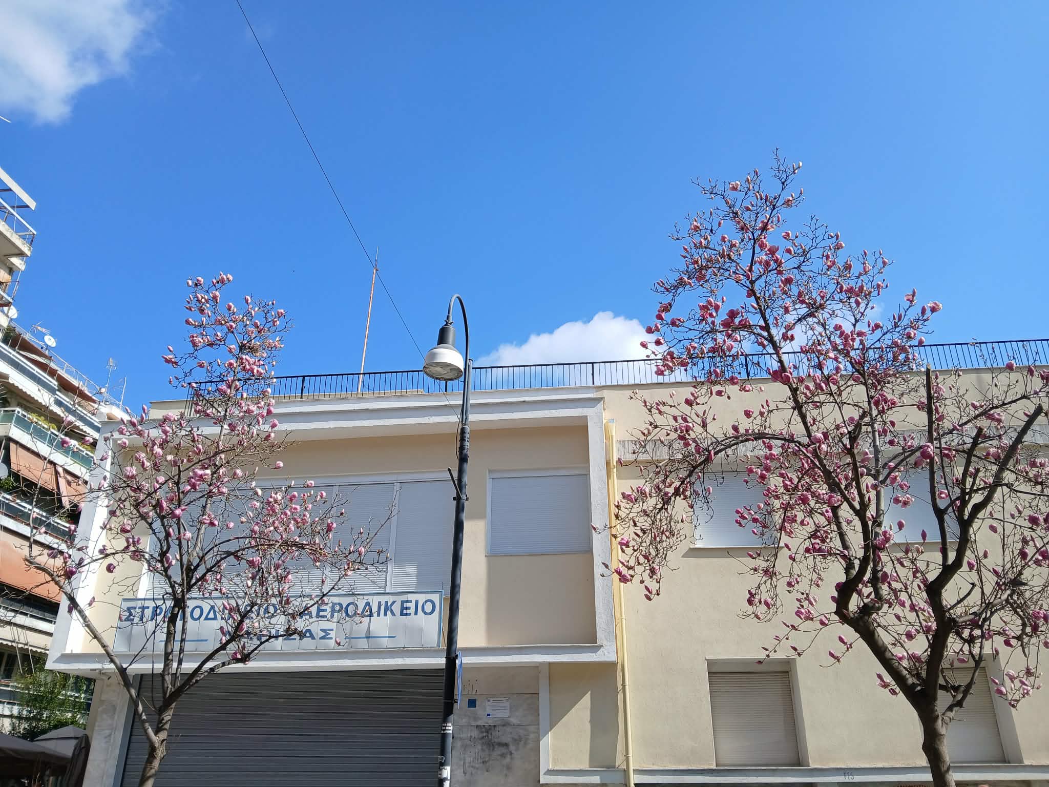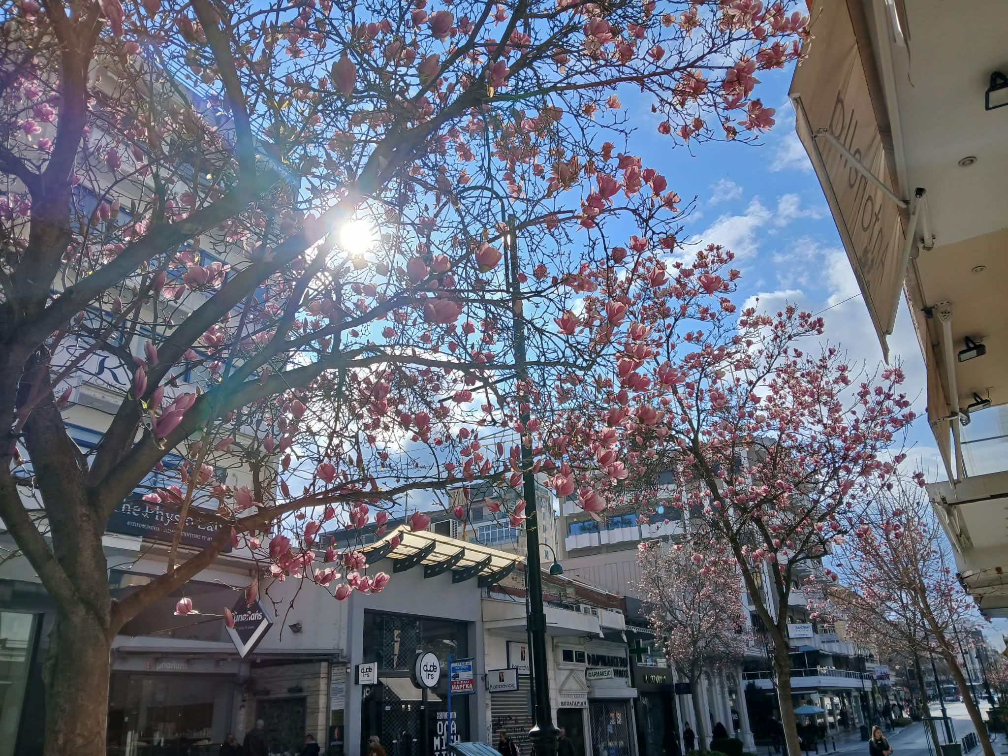 Στη Λάρισα η ηλιοφάνεια των τελευταίων ημερών και οι ήπιες για την εποχη θερμοκρασίες οδήγησαν στα ανθισμα της μανόλιας , ενός καλλωπισμού δένδρου που κοσμεί τους δρόμους του κέντρου.