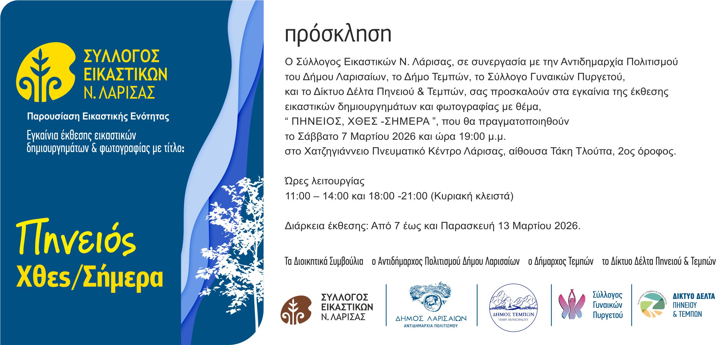 Τη διοργάνωση υπογράφουν ο Σύλλογος Εικαστικών Ν. Λάρισας, η Αντιδημαρχία Πολιτισμού του Δήμου Λαρισαίων, ο Δήμος Τεμπών, ο Σύλλογος Γυναικών Πυργετού και το Δίκτυο Δέλτα Πηνειού & Τεμπών. Η έκθεση φιλοξενείται στην αίθουσα Τάκη Τλούπα (2ος όροφος), έναν χώρο που συνδέεται άμεσα με την ιστορία των τεχνών, της φωτογραφίας και της τοπικής μνήμης.