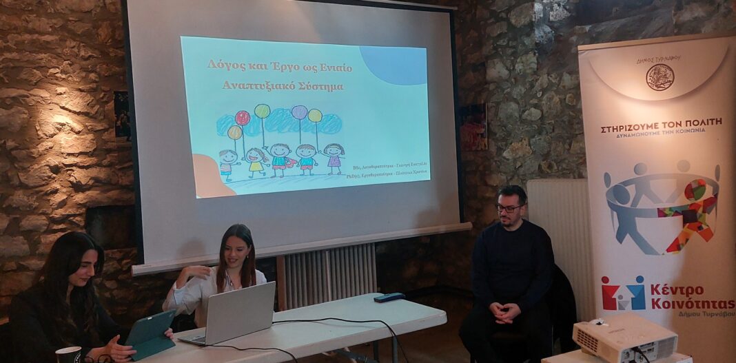 Πραγματοποιήθηκε την Τετάρτη 4 Μαρτίου του 2026 στο Αρχοντικό Καράσσου ενημερωτική ομιλία με θέμα: «Λόγος και έργο ως ενιαίο αναπτυξιακό σύστημα» με ομιλήτριες τις: Γκαντρή Ευαγγελία – Λογοθεραπεύτρια και Πλιάτσικα Χριστίνα – Εργοθεραπεύτρια σε συνεργασία με το Κέντρο Κοινότητας Δήμου Τυρνάβου και τους Βρεφονηπιακούς και Παιδικούς Σταθμούς του Δήμου Τυρνάβου.