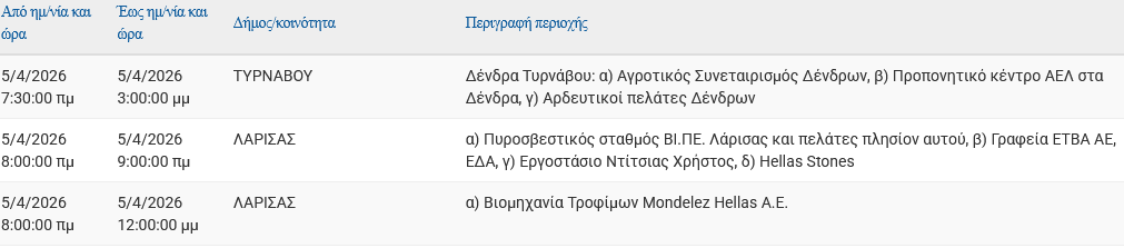 Σε προγραμματισμένες διακοπές ρεύματος προχωρά ο ΔΕΔΔΗΕ Α.Ε., σήμερα Κυριακή 5 Απριλίου, σε περιοχές της Λάρισας και του Τυρνάβου για να εκτελεσθούν απαραίτητες τεχνικές εργασίες στο δίκτυο.