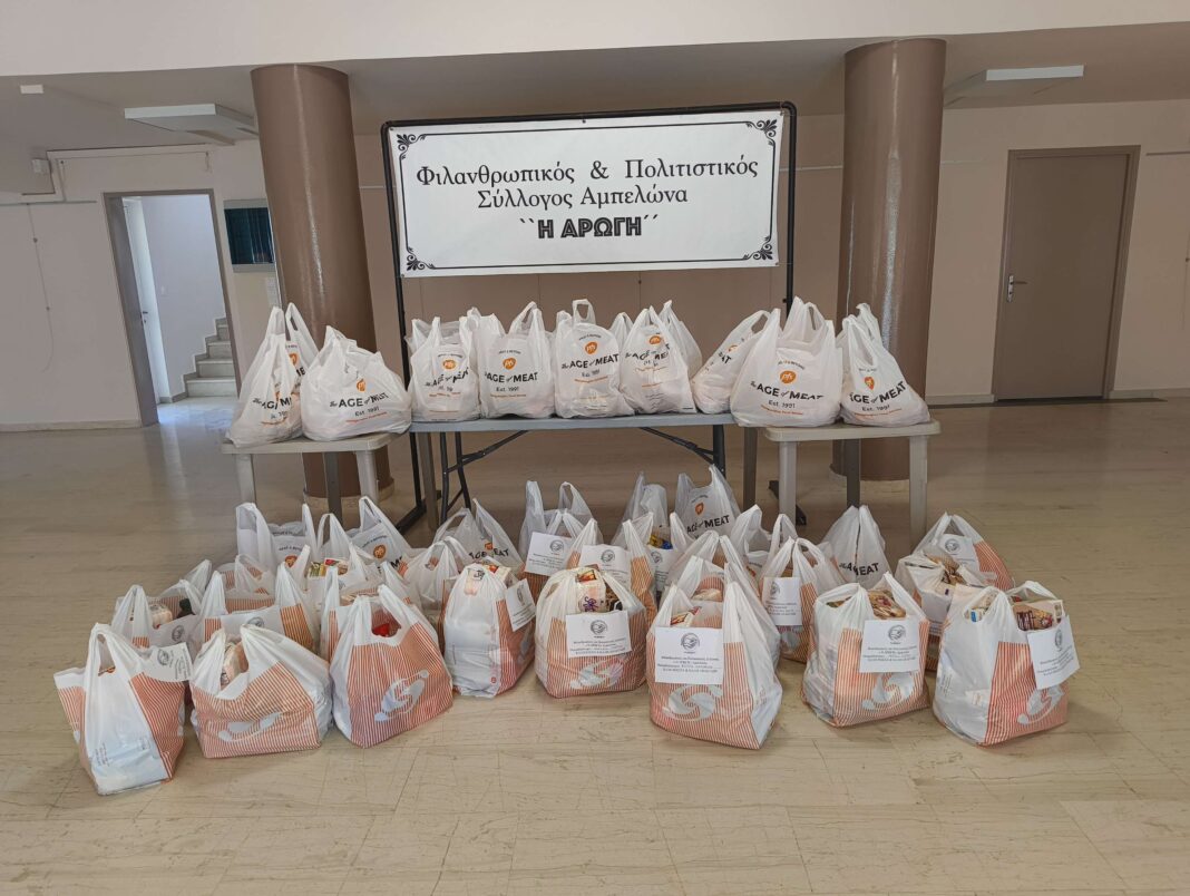 Ο Φιλανθρωπικός & Πολιτιστικός Σύλλογος «Η ΑΡΩΓΗ» Αμπελώνα στα πλαίσια της κοινωνικής Αλληλεγγύης και της προσφοράς Αγάπης προς τον συνάνθρωπο παρέδωσε σήμερα Μεγάλη Παρασκευή, ενόψει των εορτών του ΠΑΣΧΑ τρόφιμα και κρέατα σε ευάλωτες οικογένειες του Αμπελώνα και του Βρυοτόπου.